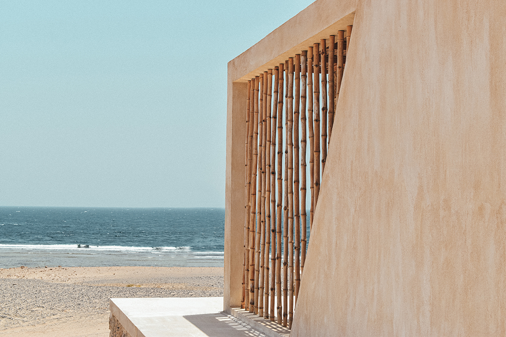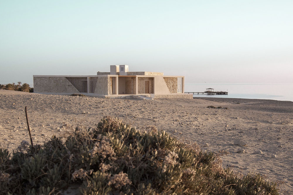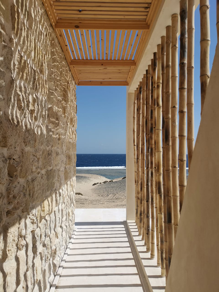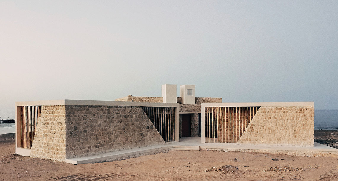 Envisioned as a truly vernacular structure within its striking location, overlooking unobstructed elevated views of the red sea and a backdrop of the serene red-sea mountain ranges, this family beach house was designed to discretely blend into the land. Using locally sourced and reclaimed fossilized coral limestone, and a extensive array of high-performance and energy-efficient design strategies, this house stands on its hilltop acting as a living thing to protect its inhabitants, complimenting and respecting its historic location within the extremely hot and arid Egyptian Eastern desert. This 3-bedroom, 1-story family vacation home ensures every single room has an unobstructed 180 views of the Red Sea. Due to the plot’s narrow width, this was achieved by creating a crab-like plan layout, whereas every one of the 3 bedrooms and the main open-plan kitchen, dining and living room space all offer unobstructed views of the sea, overlooking the small plunge pool and built-in fire-pit seating area. HIGH-PERFORMANCE