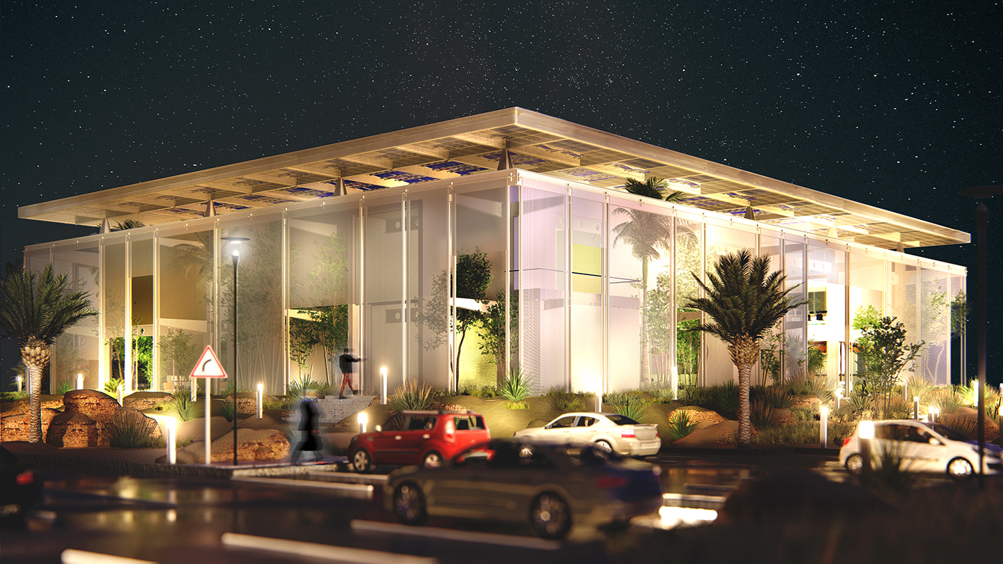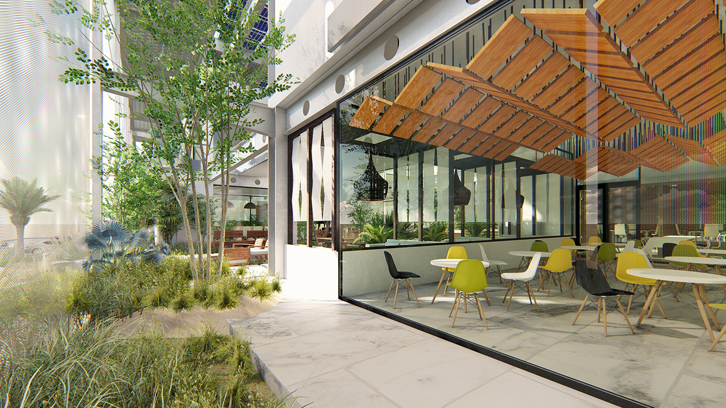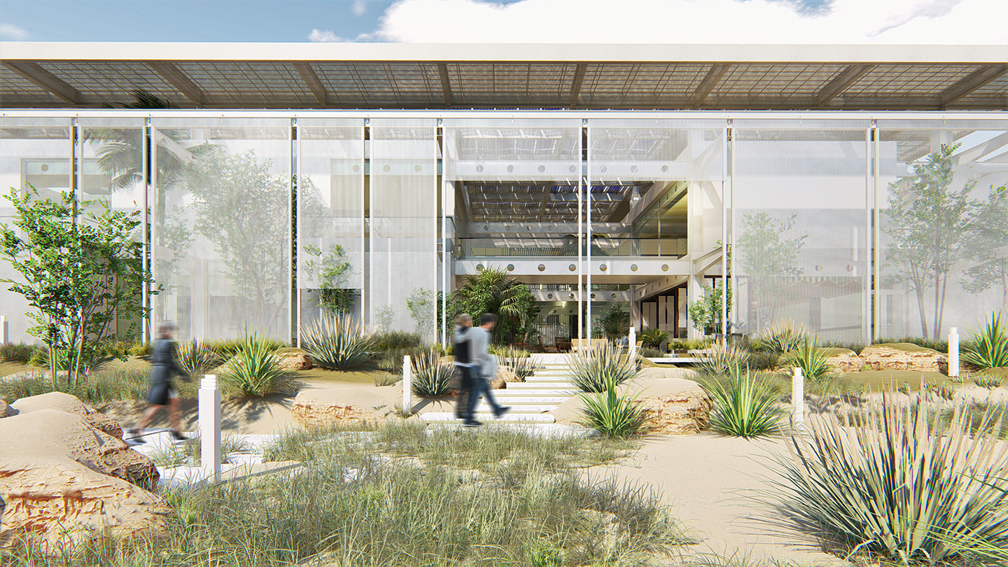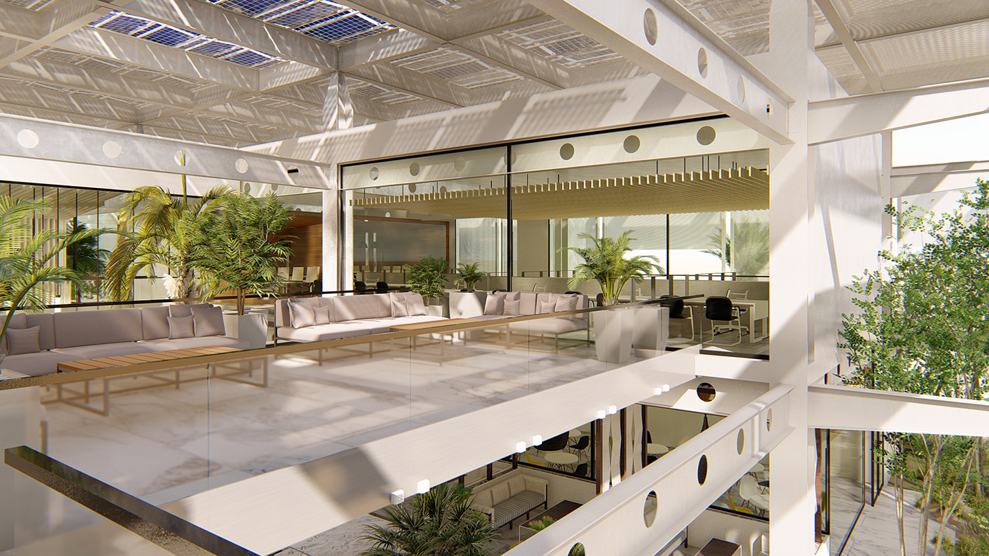 heat gain and glare, while allowing filtered natural daylight to reduce the need for artificial lighting. A second roof structure with a porous mesh and steel design provides additional sun protection while enabling airflow and filtered daylight to the open spaces and courtyards below. It also houses PV cells, encourages views of the cells, and promotes a natural flow of cooled air between the second roof and the primary roof, reducing heat gain indoors. The presence of breezy green courtyards allows for filtered natural daylight and creates intimate and user-friendly outdoor spaces, further reducing the reliance on artificial lighting during the day.