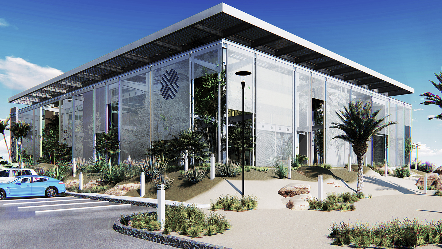 Located along the key junction highways in 6th of October City in Cairo within an underdeveloped plot of desert land, the OHD Sales Centre is envisioned as a mirage- like haven appearing within the arid desert landscape, and envisioned as a gateway to a future city that will grow in the horizon beyond the facility. HIGH-PERFORMANCE ENVIRONMENTAL STRATEGIES/The high-performance strategies employed in this building include an outer green belt that serves as a protective measure, reducing sound and air pollution from adjacent highways while creating visually appealing views and user-friendly outdoor spaces. The second skin structure blocks direct sunlight, reducing